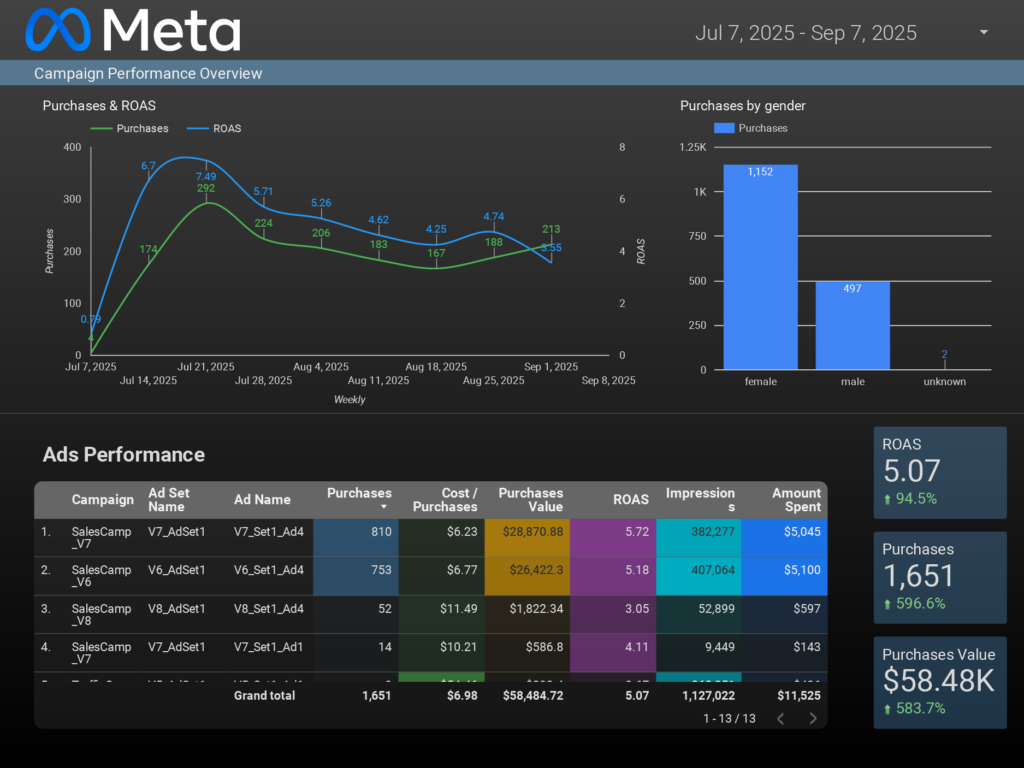 Antes de que examine mi cartera, debe saber que personalmente aprecio la transparencia. Por ello, pongo a disposición de mis clientes un cuadro de mandos interactivo y actualizado que muestra el rendimiento de un vistazo, ya sea de pago u orgánico, El informe de rendimiento se puede personalizar y adaptar al modelo de negocio. El informe de rendimiento se puede personalizar y adaptar al modelo de negocio, mostrando los KPI que importan, como por ejemplo Suscripciones, Instalación de aplicaciones, Compras, Rentabilidad de la inversión publicitaria (ROAS), Contactos generados, y Clientes potenciales convertidos.